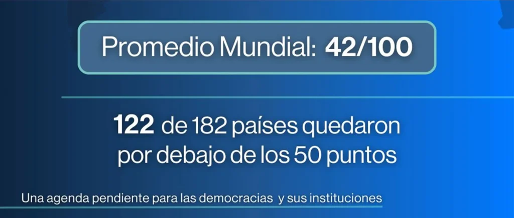 En este nuevo informe, Argentina obtuvo 36 puntos sobre 100 y descendió al puesto 104 del ranking global. A nivel regional, se ubica en el puesto 19 de 33 países de América, en un contexto donde América Latina continúa mostrando avances débiles y retrocesos persistentes.